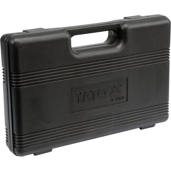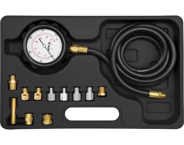 Souprava k měření kompresního tlaku oleje YATO-73030. Zahrnuje 12 redukcí umožňující používat přístroj ve většině motorů.