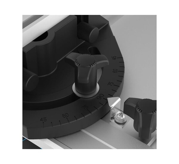 Stůl okružní pily (vrchní) se stavitelným podélným - úhlovacím dorazem • otočný řezací stůl, zaručující precizní zkrácení řeziva příčně i na pokos.