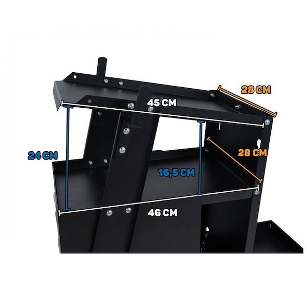 - dvě prostorné police – ideální pro větší nástroje, svářečku nebo jiné zařízení