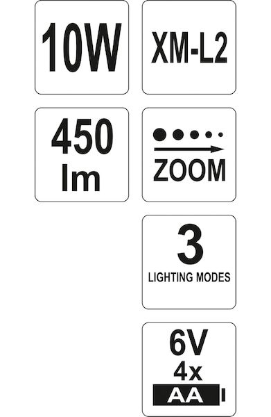 Svítilna je vybavena funkcí ZOOM, která umožňuje regulovat paprsek světla a tím osvětlovat blízké, nebo vzdálené objekty. Také disponuje třemi různými režimy světla (plné 100%, úsporné 50% a blikání SOS).