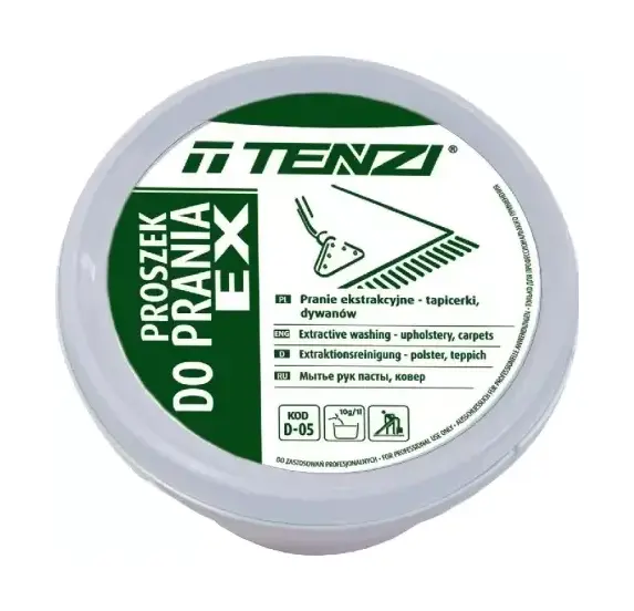 Tenzi Prací prášek je vysoce účinný, bezvonný prací prášek určený k čištění textilních povrchů, jako jsou koberce, čalounění a pohovky. Produkt je ideální pro použití s extrakčními vysavači, přičemž efektivně odstraňuje organické nečistoty a staré skvrny bez poškození materiálu. Aktivní složky pronikají hluboko do struktury vláken a obnovují jejich původní vzhled. Vhodný na textilie s trvalými barvami, poskytuje důkladné čištění i při silném znečištění.