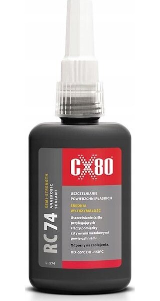 CX80 RC-74 Anaerobic Sealant je anaerobní těsnicí tmel určený k utěsnění kovových plochých povrchů. Tento produkt je ideální pro aplikace, kde je potřeba střední pevnost a odolnost vůči médiím, jako jsou oleje, paliva, chladicí kapaliny či voda. Vytváří trvanlivý, chemicky odolný spoj, který zabraňuje únikům a zajišťuje spolehlivou funkčnost mechanických sestav.