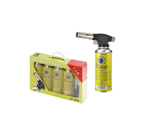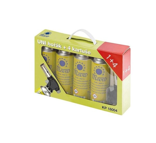 Universální hořák s piezoelektrickým zapalováním v praktickém setu se 4 kartušemi. Určeno pro kutily řemeslníky, kuchaře (flambování). Po 20 sekundovém předehřevu možnost pracovat v jakékoliv poloze.