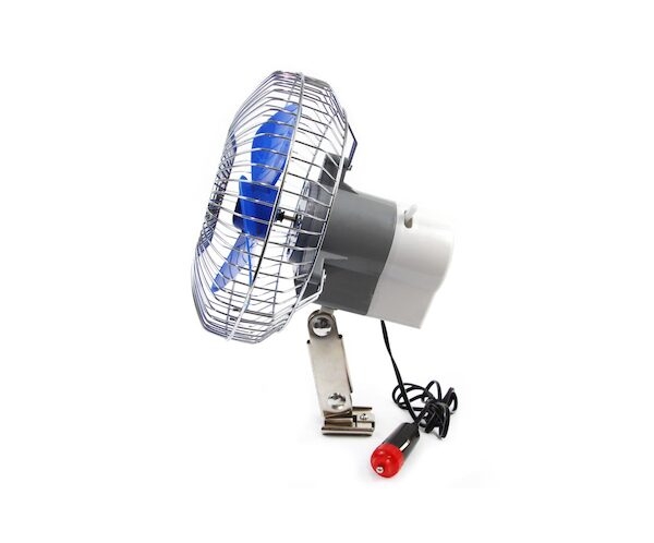 Velký kovový ventilátor AMiO do auta napájený z 12V zásuvky zapalovače.