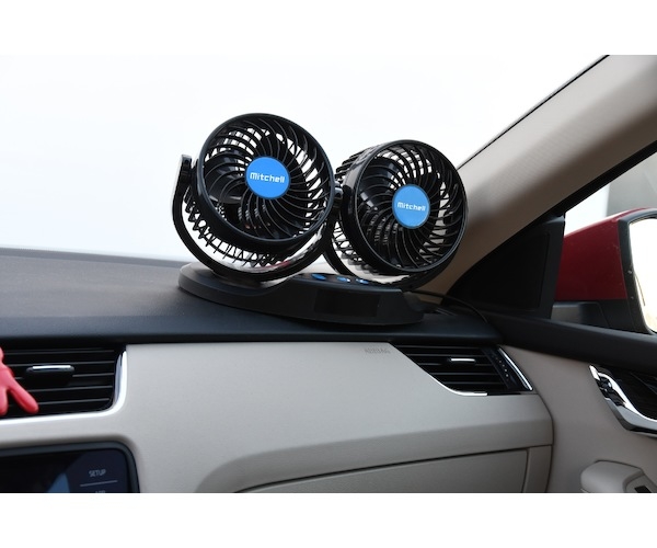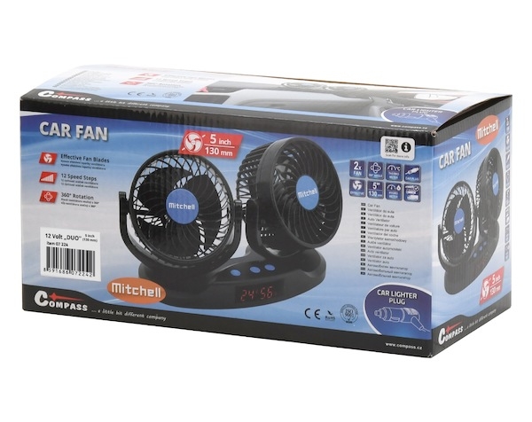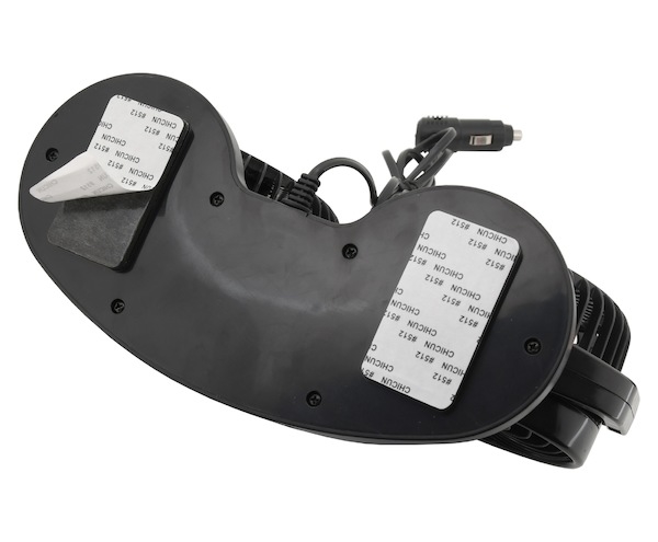 Napájení 12 V ze zásuvky autozapalovače. Oba ventilátory průměru 13 cm lze nezávisle na sobě natočit libovolným směrem. Sestava ventilátorů se upevňuje pomocí přiložených dvou kusů lepících destiček, které zajišťují precizní a silné uchycení.