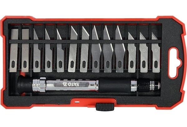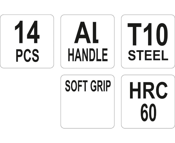 Sada 14 přesných nožů z precizní T10 oceli. Ocel T10 má velmi vysokou tvrdostí HRC60 ta zajišťuje výjimečnou ostrost a trvanlivost břitu. Rukojeť je vyrobena z hliníku s otočným hrotem. Sada je uložena v krabičce odolné proti nárazům. Technická data Sada 14ks Zhotovení rukojeti hliník s měkčeným úchopem Materiál nožů ocel T10 Tvrdost nože HRC60