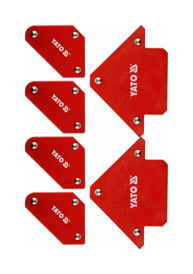 Sada 6 magnetických svařovacích úhelníků YT-08678 vyrobených z ocelového plechu a silných feritových magnetů. Povrch s práškovým nástřikem. Určeno pro dočasné spojování kovových prvků při svařování, vrtání a lakování.