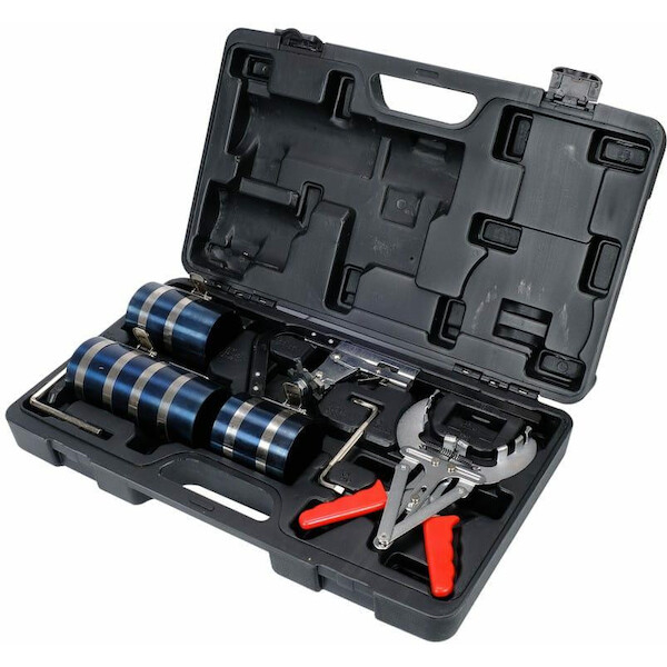 Profesionální sada pro servis pístních kroužků a pístů. Obsahuje kleště pro demontáž a montáž pístních kroužků bez poškození součástí. Sepnutím ramen se otevře pístní kroužek držený na místě bočními čelistmi otevřením středních čelistí. Uvolnění tlaku umožňuje vložení kroužku do drážky kolem pístu. Zařízení na čištění drážek pístu od nahromaděných karbonových usazenin, vybavené třemi kotouči s lopatkami.
