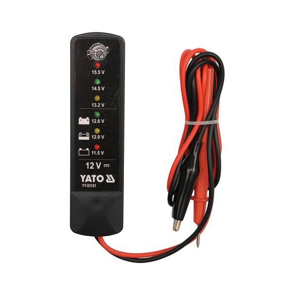 Yato tester autobaterií LED YT-83101 Tester pro kontrolu stavu 12 V akumulátorů a dobíjení alternátorů osobních automobilů. Naměřené hodnoty jsou zobrazovány pomocí LED přístroje. Rozsah měřených hodnot 13,2 - 15,5 V pro alternátory a 11,5 - 12,6 V pro stav akumulátorů. Délka propojovacích kabelů 830 mm, splečně s rozměry zakončení, zajišťují pohodlné nasazení i v těch nejmenších prostorech. Technická data rozsah měření akumulátorů 11,5 - 12,6 V rozsah měření alternátorů 13,2 - 15,5 V signalizace LED délka propojovacích kabelů 830 mm