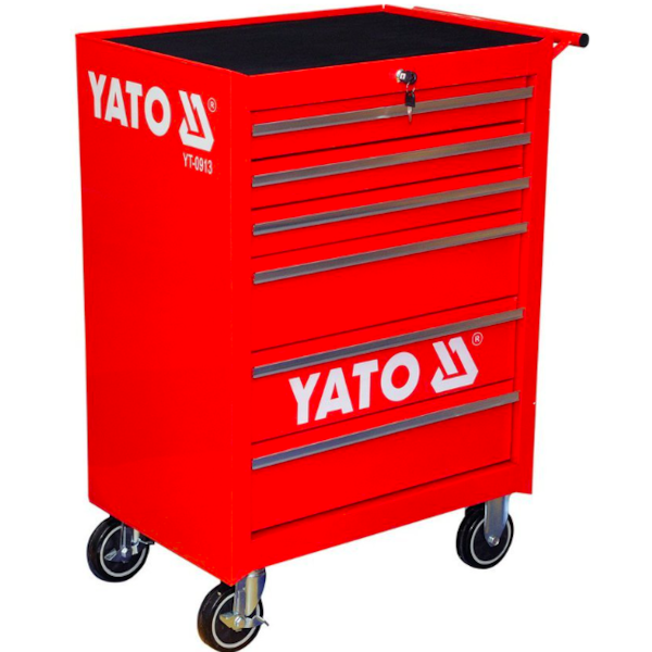Dílenská skříňka značky YATO, vybavena 6 zásuvkami s kuličkovými ložisky s centrálním zamykáním. Skříňka je vybavena kolečky o průměru 127 mm, dvě jsou opatřena brzdami. Horní deska skříňky může sloužit jako stůl, je vyrobena z protiskluzového polypropylenu. Skříňka o rozměrech 995 x 680 x 458 mm je zhotovena z oceli, její nosnost činí 300 kg.