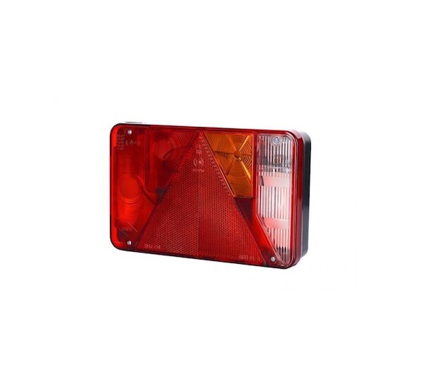 Zadní sdružené světlo pravé se zpětným světlem a odrazkou ve tvaru trojúhelníku, s uchycením na šrouby M6, pro přívěsné vozíky, čtyřkolky, traktorky domácí výroby, přívěsy, vlečky atd. Montáž na dva šrouby ze zadní strany, včetně matic.