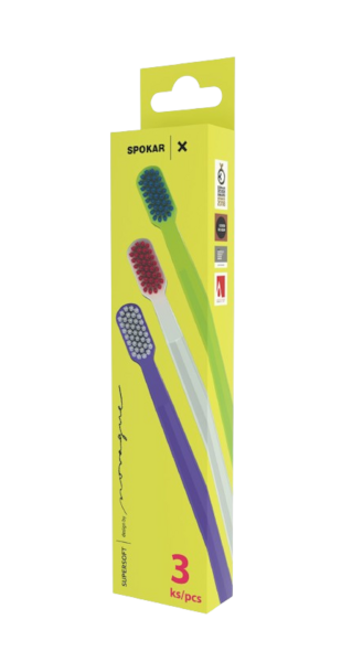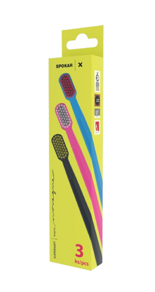 Oblíbený zubní kartáček SPOKAR X je nyní nabízen také v praktickém balení po třech kusech.