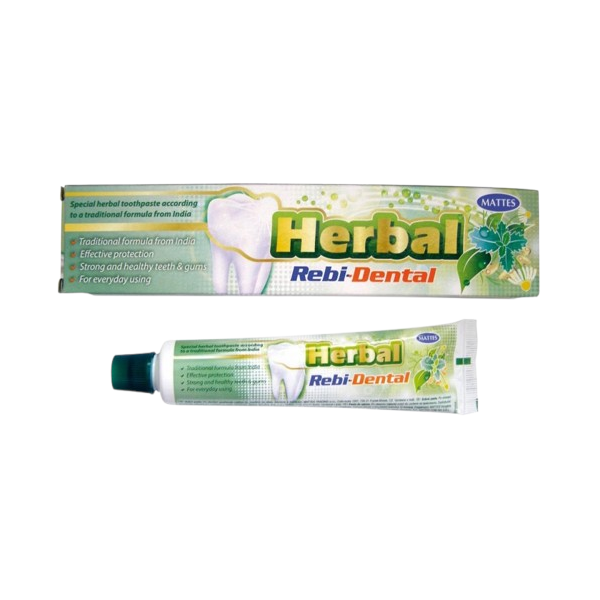 Rebi-Dental Herbal - zubní pasta ke každodenní péči o chrup a dásně. Speciální složení sestavené podle tradiční indické receptury působí velmi příznivě na zuby, zklidňuje bolavá a citlivá místa, snižuje krvácivost dásní a napomáhá jejich lepšímu prokrvování a tím přispívá k prevenci jejich onemocnění.